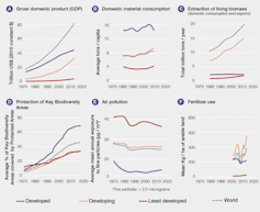 Las mismas razones que han llevado a que en las últimas cinco décadas la población mundial se haya multiplicado por dos, la economía mundial medida por su producto interior bruto se haya multiplicado por cuatro y el comercio internacional por diez. Así, los indicadores sobre interacción entre sociedad y medio ambiente a nivel global que hemos considerado muestran un crecimiento significativo de la economía global y sus impactos sobre la naturaleza con diferencias a nivel regional (Figura 2).