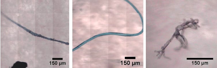Los plásticos identificados incluyen poliésteres, poliamidas, y poliolefinas, que se encuentran entre los plásticos más utilizados, así como fibras artificiales tales como viscosa o algodón teñido, sobre todo de azul.