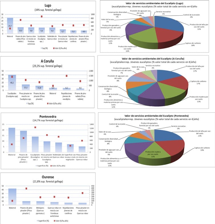 La valoración económica de los servicios ambientales del eucalipto realizada por el sector maderero alcanza mejores resultados para las variables productivas (madera y leña, y alimentos) respecto a las correspondientes al control de la erosión o los usos recreativos. Además, asigna a la captura de CO₂ un valor entre el 17 y 19 % del total, aunque, como se ha señalado, sería conveniente elaborar una metodología rigurosa que considere todos los flujos de carbono en estas plantaciones.