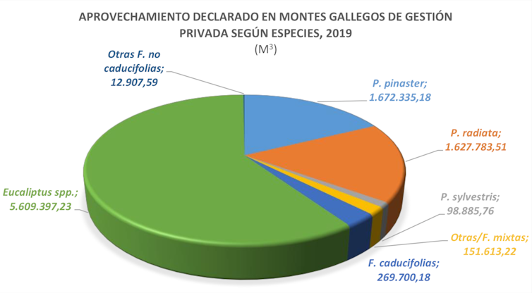 En 2019, el aprovechamiento declarado en montes gallegos alcanzó los 9,4 millones de m³. Su gestión fue privada en un 97,3 %, repartiéndose entre un 62,4 % de frondosas –en su práctica totalidad eucalipto– y un 37,6 % de coníferas (P. radiata y P. pinaster).