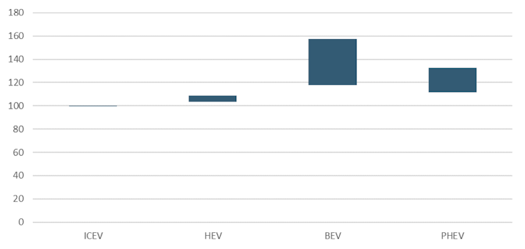He asignado el valor de 100 a los vehículos de combustión interna (ICEV) que emplean combustibles fósiles y se muestra la comparación frente a otras tecnologías: híbridas (HEV), eléctrica (BEV) e híbridas enchufables (PHEV). Para cada tecnología, los valores se representan en forma de barra, recogiendo todo el rango de valores de los resultados obtenidos de las distintas fuentes bibliográficas.
