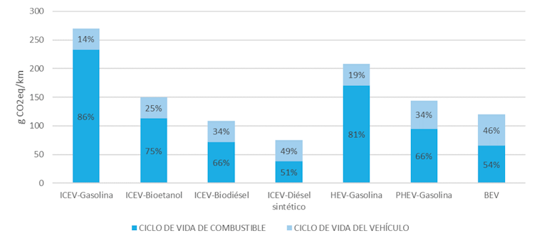 En la figura 2, se representan estas contribuciones para las cuatro tecnologías comparadas y en el caso de un vehículo turismo de tamaño medio (en el caso de los vehículos de combustión interna se han considerado como combustibles la gasolina de origen fósil, biocarburantes y el diésel sintético; para híbridos e híbridos enchufables, únicamente la gasolina de origen fósil).
