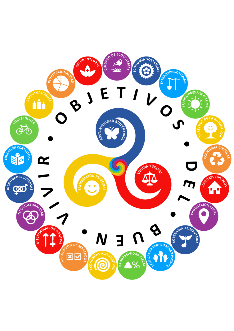 La propuesta de los Objetivos del Buen Vivir se articula en tres objetivos generales y veintiún objetivos específicos, encaminados a la consecución de las tres armonías (ambiental, social y personal) que deben caracterizar el buen vivir global (o el transdesarrollo global).