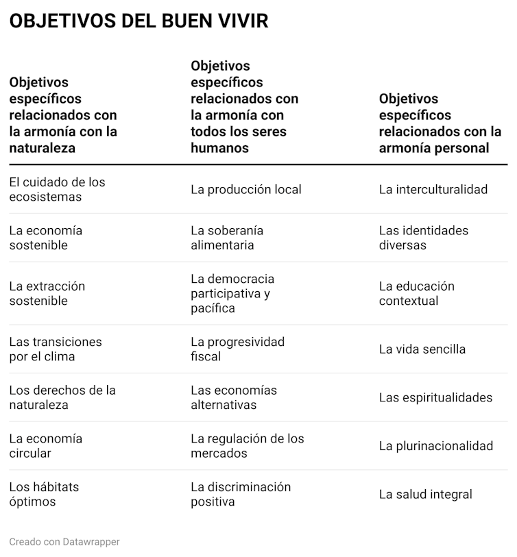 Estos tres objetivos se encontrarían interrelacionados por lo que sería imposible alcanzar el buen vivir si no se cumpliesen simultáneamente los tres. No obstante, existiría una jerarquía entre objetivos: la sostenibilidad biocéntrica limitaría los medios para alcanzar la equidad social, y la sostenibilidad biocéntrica y la equidad social limitarían los medios para alcanzar la satisfacción personal.